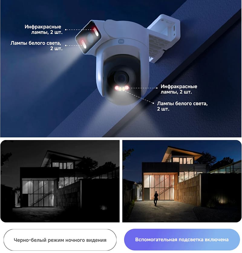 Xiaomi Outdoor Camera CW500 Dual — уличная камера видеонаблюдения гибридного типа, объединяющая в одном корпусе два независимых оптических модуля. Ключевое отличие модели заключается в комбинации стационарного объектива для контроля общего плана и поворотного PTZ-модуля для детального отслеживания движущихся объектов. Такая архитектура исключает «слепые зоны», вне зависимости от того, где находится камера, в помещении или на улице.