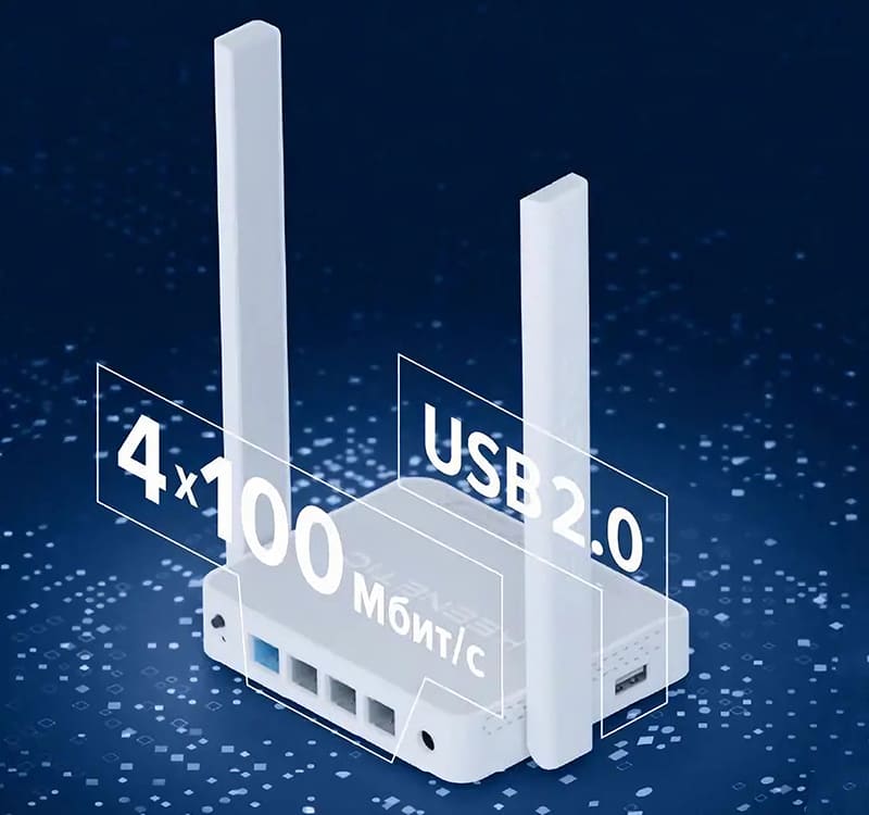 Роутер работает в диапазоне 2,4 ГГц и обеспечивает скорость беспроводного соединения до 300 Мбит/с по стандарту 802.11n (Wi-Fi 4). Две внешние несъёмные антенны с коэффициентом усиления 5 dBi обеспечивают устойчивое покрытие в типичной квартире площадью 50–70 квадратных метров.