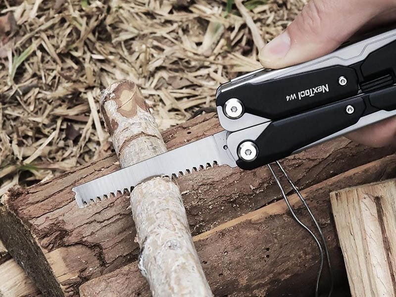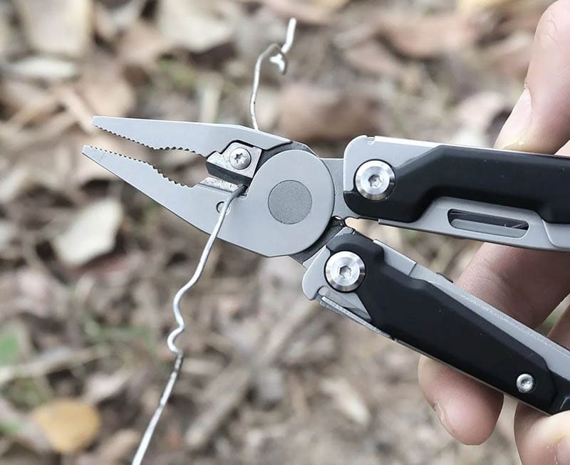 Пассатижи, нож, пила, напильник и резаки выполнены из стали 8Cr15 и 30Cr13, устойчивой к коррозии. Нож с прямым лезвием фиксируется замком liner lock, что добавляет уверенности при резе. Пила с серрейторной заточкой подходит для дерева и пластика. Напильник двусторонний — для работы по металлу и дереву.