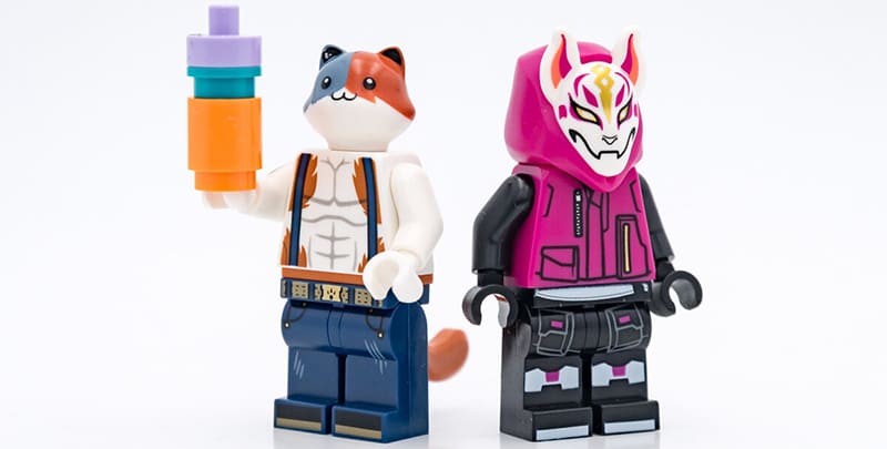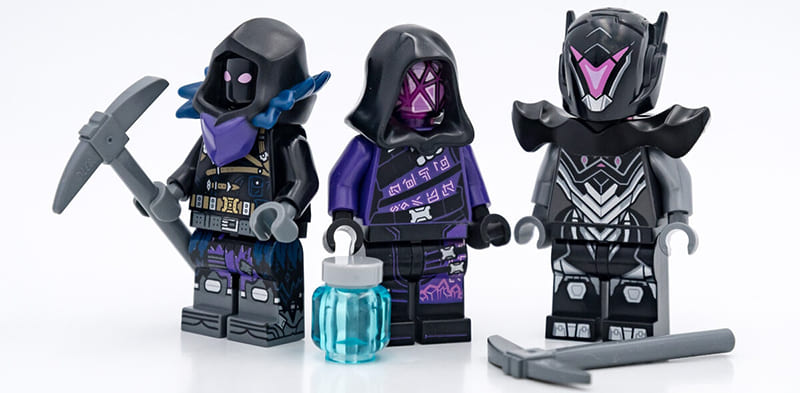 Главная особенность набора — сразу девять минифигурок персонажей Fortnite, каждая со своим стилем и оружием. Набор включает: Battalion Brawler (вариант Джоунси), Adventure Peely, Brite Bomber, Cuddle Team Leader, Cube Assassin, Trespasser Elite, Drift, Meowscles и Raven.