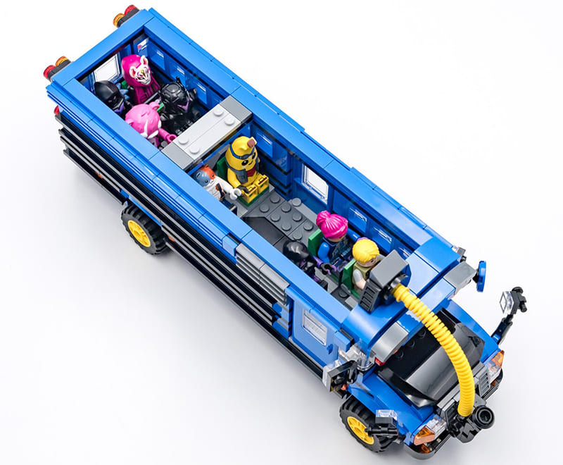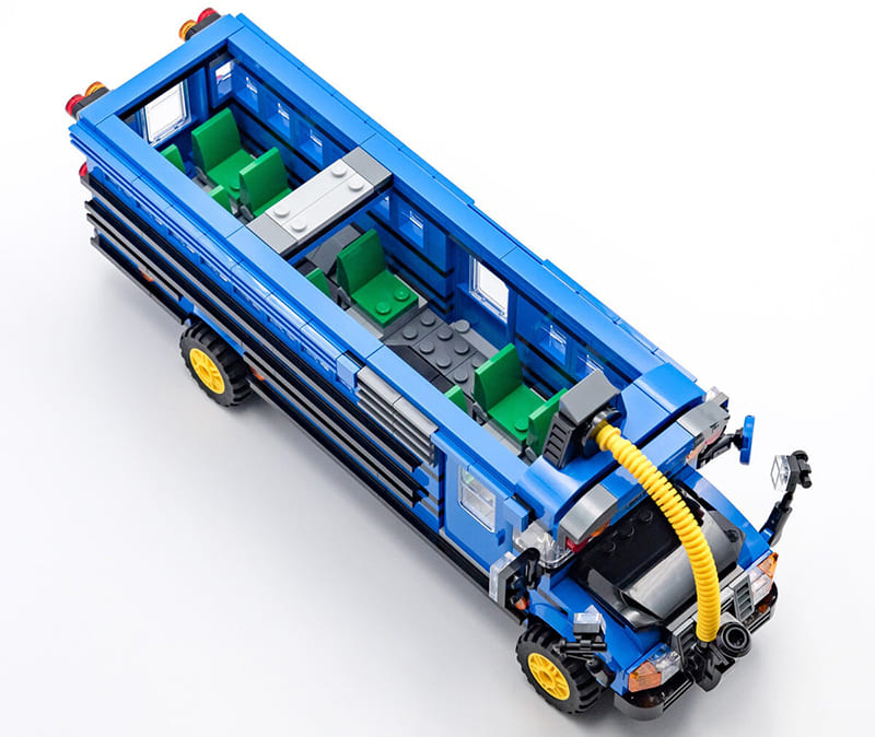 Основой модели служит кирпичная версия синего американского школьного автобуса с характерной высокой крышей и длинным корпусом. Кузов построен на прочной раме: нижняя часть представляет собой шасси с колёсами, а верхняя — модульный корпус с окнами и крышей.