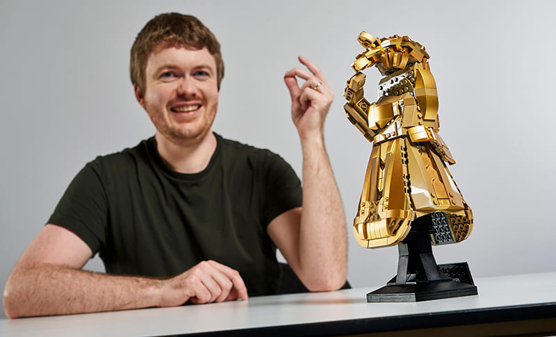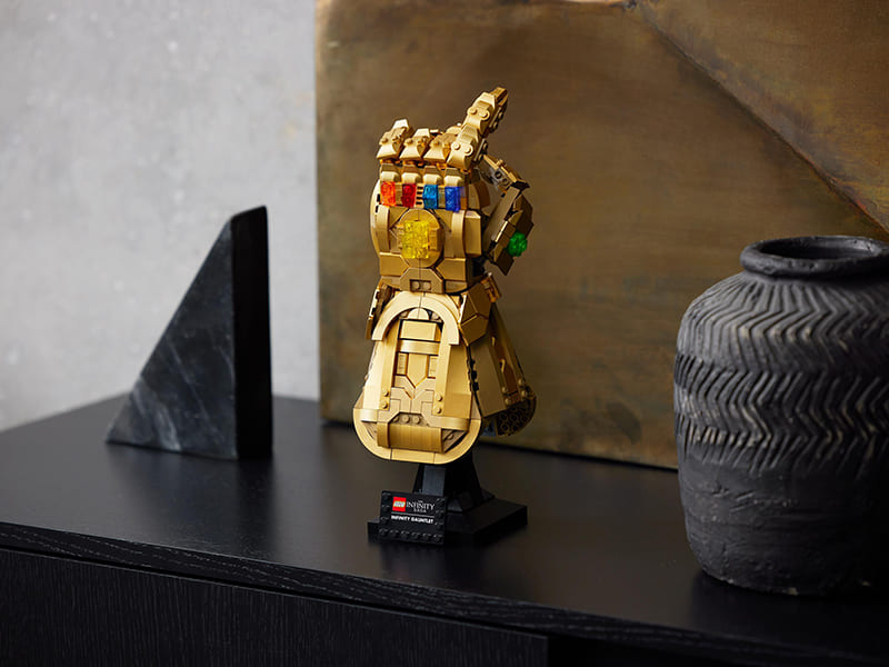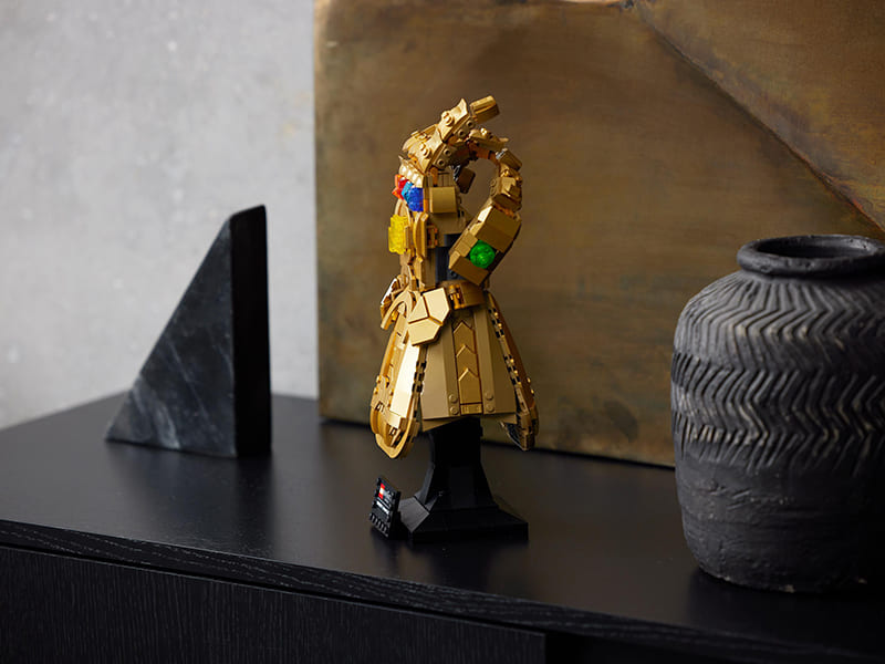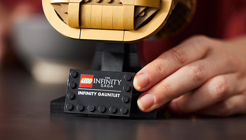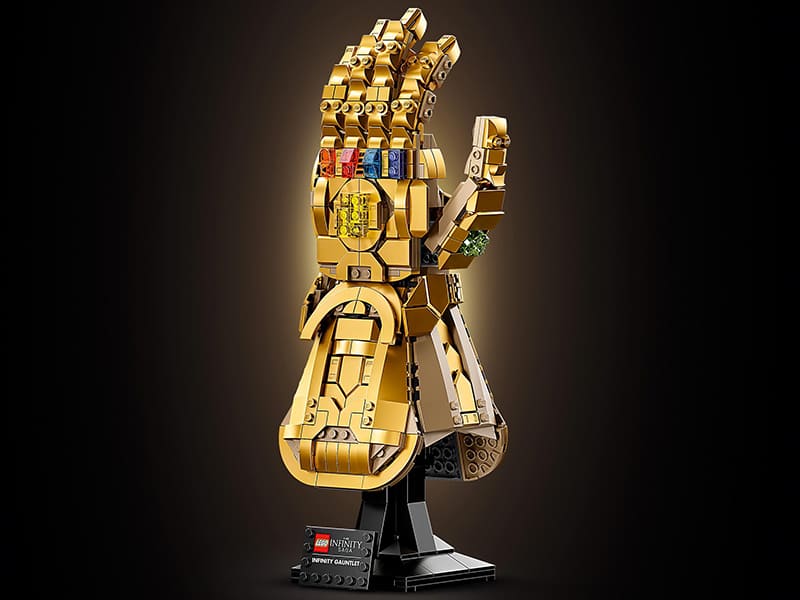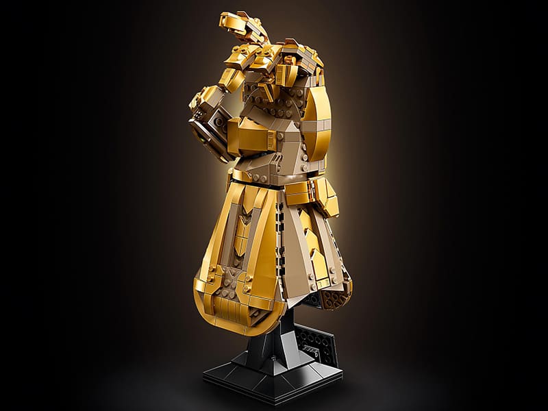 Модель представляет собой золотую Перчатку бесконечности в стиле киновселенной Marvel, установленную на устойчивой чёрной подставке с декоративной табличкой с названием набора. Корпус перчатки собран из элементов золотого, бежевого и песочного оттенков, за счёт чего создаётся эффект металлической поверхности и объёма.