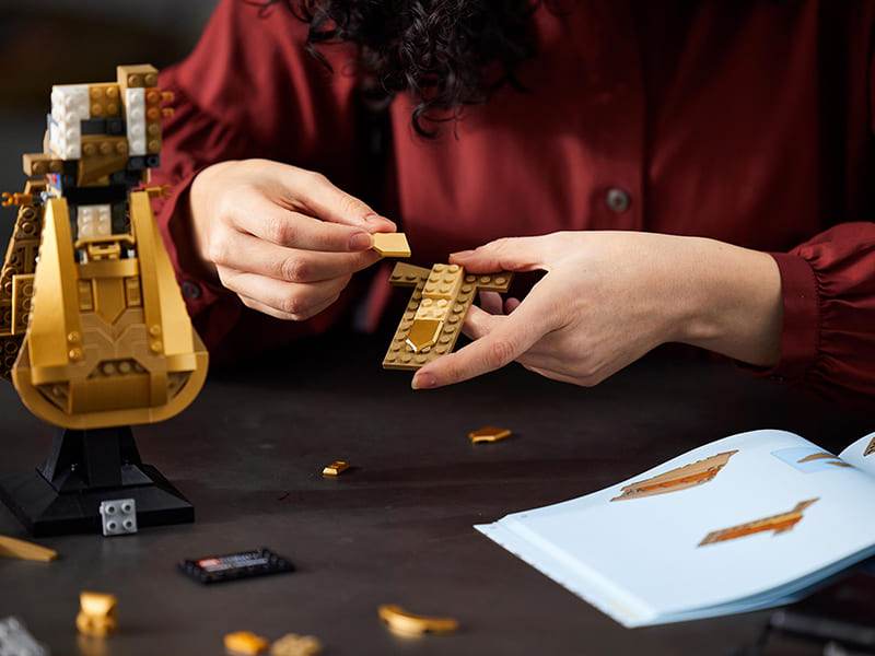 Размеры позволяют разместить перчатку на полке, в витрине или на рабочем столе: модель достаточно крупная, чтобы выделяться, но не занимает много пространства. Отсутствие минифигурок подчёркивает её статус как декоративного экспоната, а не игрового набора.