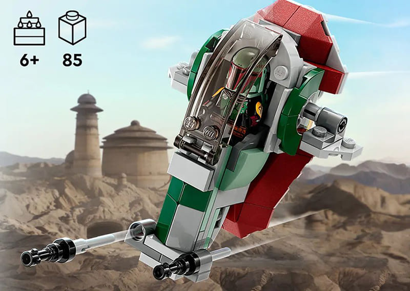 LEGO Star Wars 75344 «Звездолёт Бобы Фетта» — это микрофайтер, представляющий культовый корабль охотника за головами в уменьшенном формате. Набор создавался как быстрый для сборки комплект, который знакомит детей с техникой серии Star Wars и позволяет разыгрывать сцены из «Книги Бобы Фетта», «Мандалорца» и классической саги.