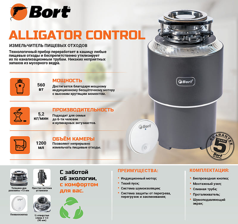Bort Alligator Control — мощный бытовой диспоузер, предназначенный для быстрой и гигиеничной утилизации органических отходов через кухонную мойку. Устройство монтируется под раковину и механически перетирает остатки пищи в мелкодисперсную кашицу, которая легко смывается в канализацию. Ключевым отличием модели является встроенная система автоматического управления с функцией автоотключения и инновационная беспроводная кнопка запуска, не требующая элементов питания.