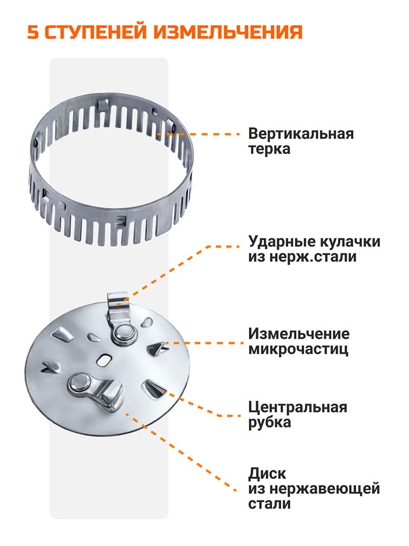 Уникальная система дробления включает пять этапов, в ходе которых отходы последовательно превращаются в мелкодисперсную взвесь. Камера объемом 1400 мл, выполненная из ударопрочного композитного материала, оснащена дробящими элементами из нержавеющей стали. Это позволяет эффективно перемалывать широкий спектр продуктов, включая мелкие кости, ореховую скорлупу и жесткие овощные очистки, делая конечный продукт безопасным для всех типов канализационных систем.