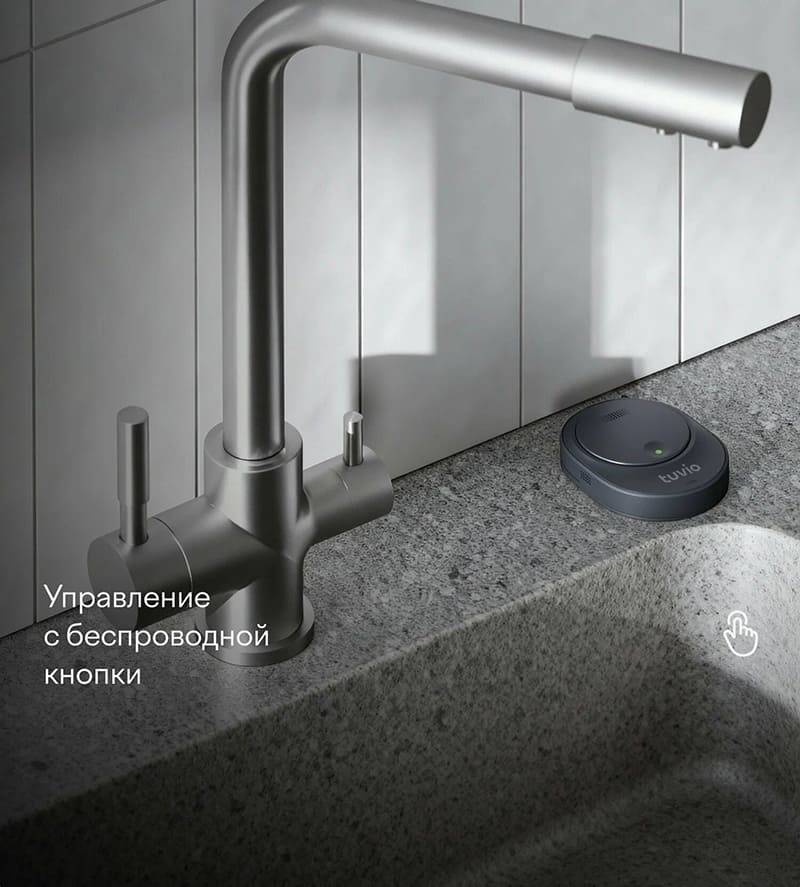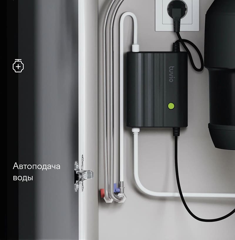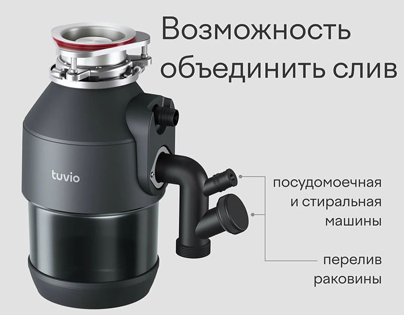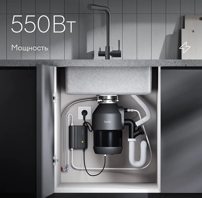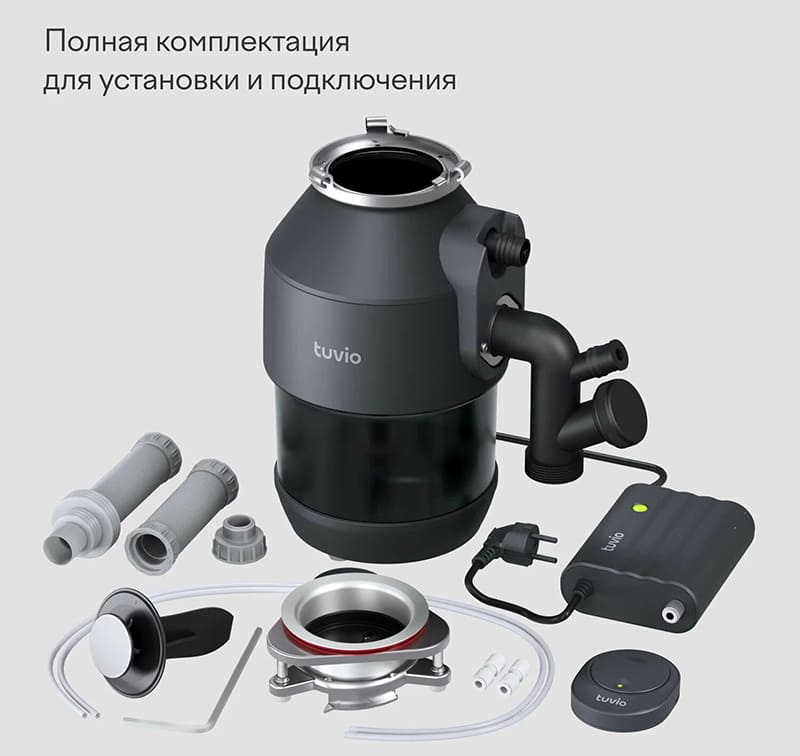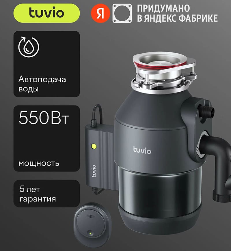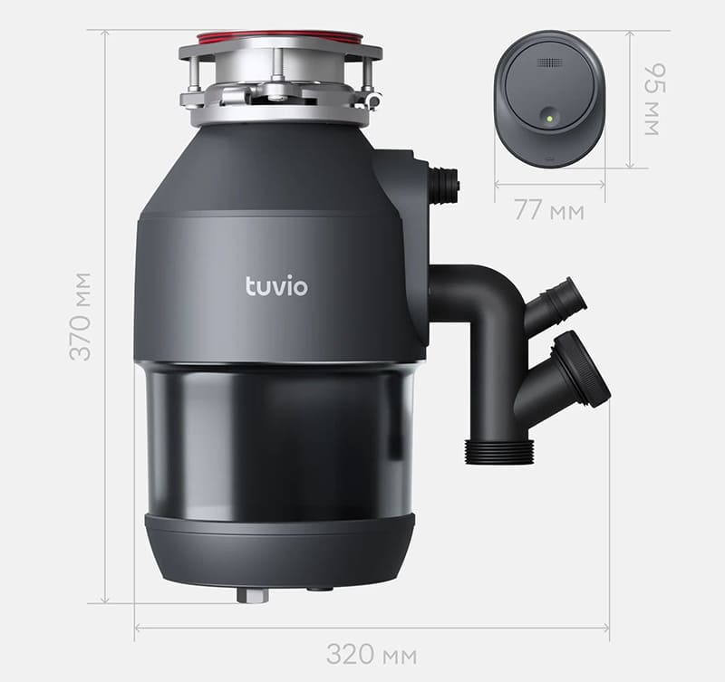 Измельчитель пищевых отходов Tuvio KDA25H11 устанавливается под раковину вместо стандартного сифона и превращает пищевые отходы в мелкие взвеси, которые легко смываются в канализацию. Устройство работает от электросети и управляется беспроводной кнопкой, установленной на столешнице. Основное отличие этой модели — сочетание мощного мотора, автоматической подачи воды и встроенной подсветки, которая облегчает наблюдение за процессом измельчения.