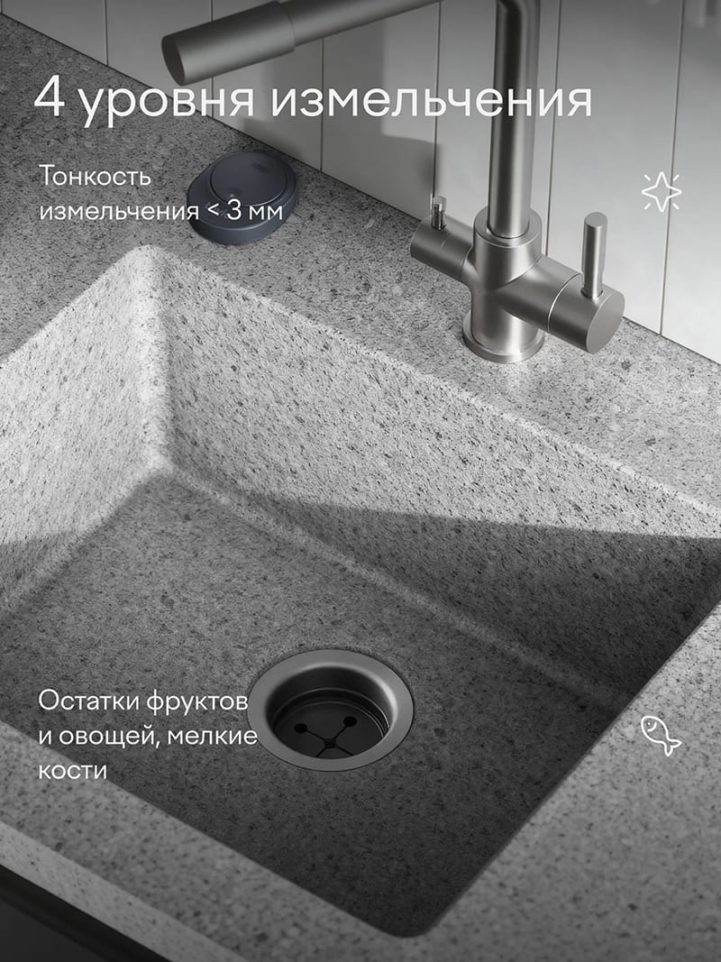 Рабочая камера вмещает 2 литра пищевых отходов одновременно. Это достаточный объём для измельчения накопившихся за день отходов среднего домохозяйства. Загрузка организована как непрерывная, что означает возможность добавлять новые отходы в ходе работы устройства без его остановки. Поток воды смывает готовые взвеси, освобождая пространство для новых порций.