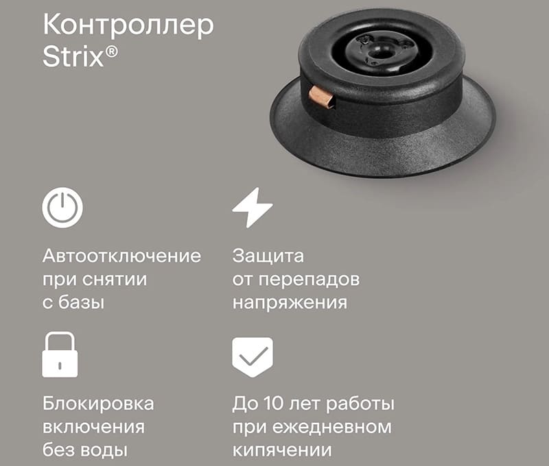 Чайник оснащен механическим управлением — одной главной кнопкой включения/выключения. Это решение обеспечивает надёжность и долговечность устройства. Управление простое и интуитивное, не требует инструкций.