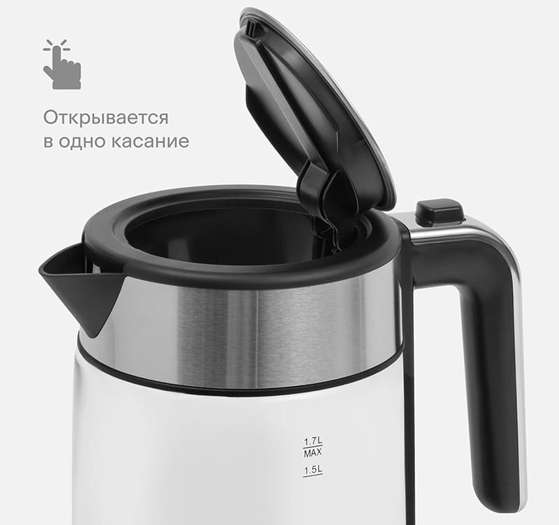 Чайник выполнен в элегантном серебристом цвете с корпусом из термостойкого стекла, нержавеющей стали и пластика. Прозрачный стеклянный корпус позволяет визуально контролировать уровень воды. Компактные габариты и вес делают чайник удобным в использовании. Широкая горловина обеспечивает лёгкое наполнение и простую очистку внутренней поверхности. Крышка открывается при нажатии кнопки на ручке.