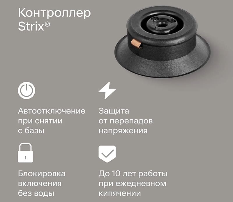 Устройство оснащено контроллером Strix — международным стандартом безопасности для электрических чайников. Система обеспечивает: