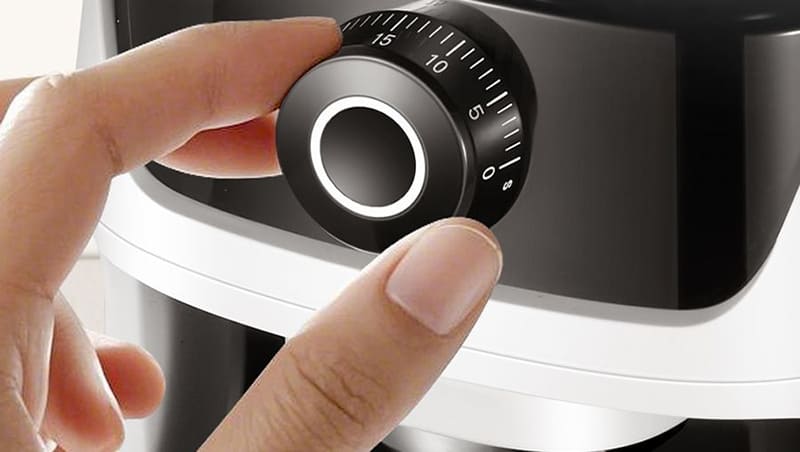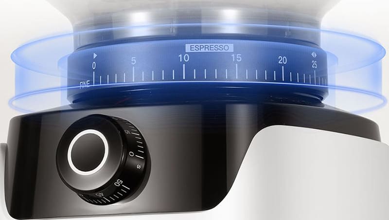 Амортизированная ручка-регулятор работает по часовому механизму и позволяет точно установить время помола от 1 до 50 секунд. Нажатие кнопки запускает процесс, плавное вращение ручки даёт полный контроль над результатом.
