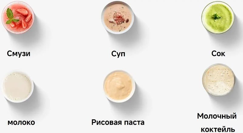 - Список автоматических программ: смузи, суп, сок, соевое молоко, рисовая паста, молочный коктейль