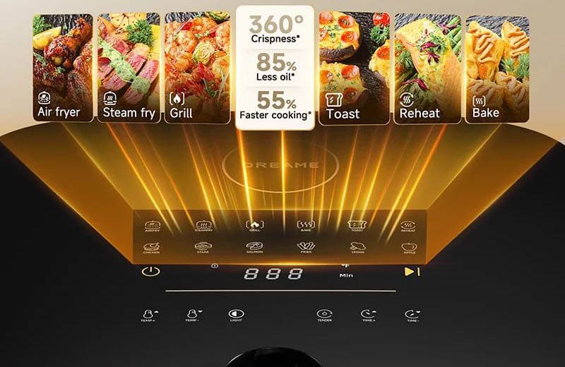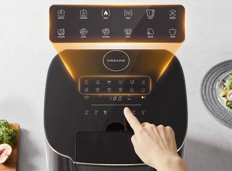 Аэрогриль Dreame Air Fryer AF30 — многофункциональное устройство для здоровой и быстрой готовки. Сочетая эффекты воздушной обжарки, гриля, обжарки с подачей пара, выпечки и подогрева, эта модель заменяет на кухне сразу несколько приборов.