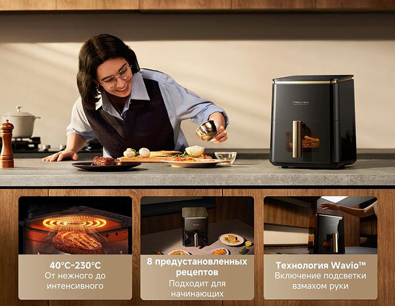 Уникальная система Wavio — это встроенная LED-подсветка, которая автоматически включается при взмахе руки перед датчиком, позволяя наблюдать за процессом приготовления в реальном времени без открывания крышки. Это не только удобно, но и исключает теплопотери, помогая сократить время готовки.