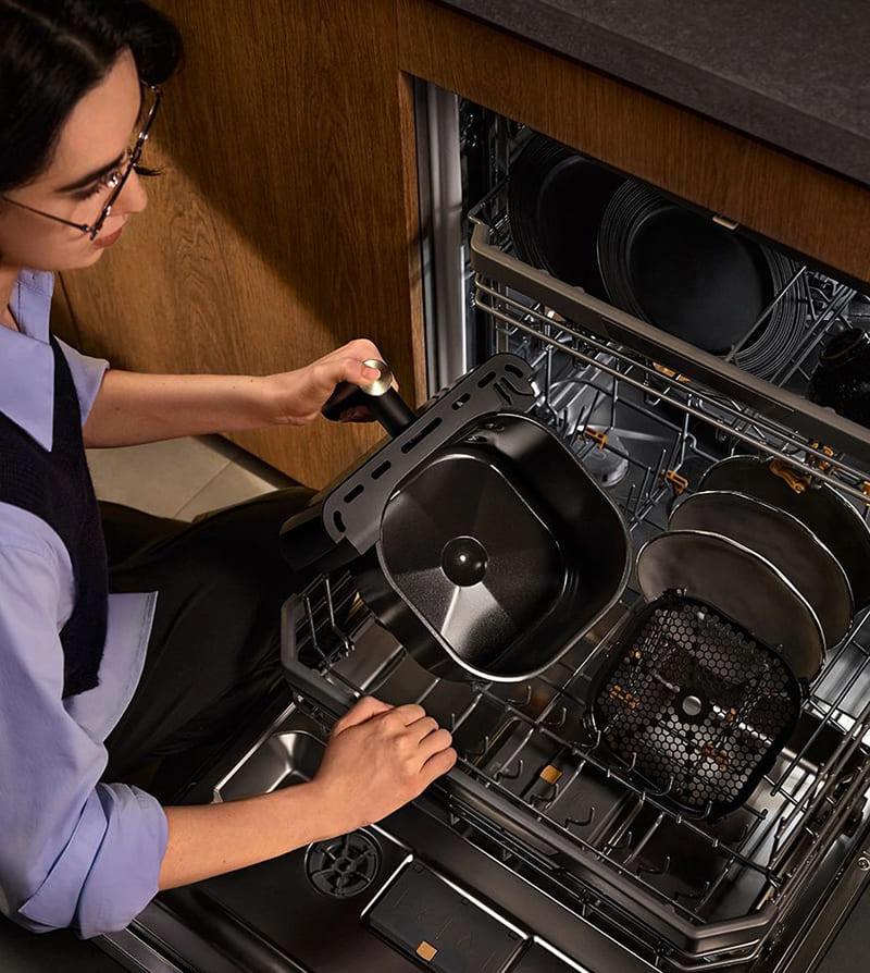 В комплект входят съёмные аксессуары с антипригарным керамическим покрытием, включая основную корзину и решётку, которые можно мыть в посудомоечной машине.