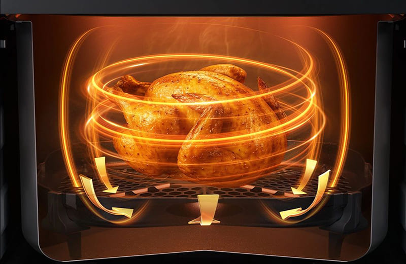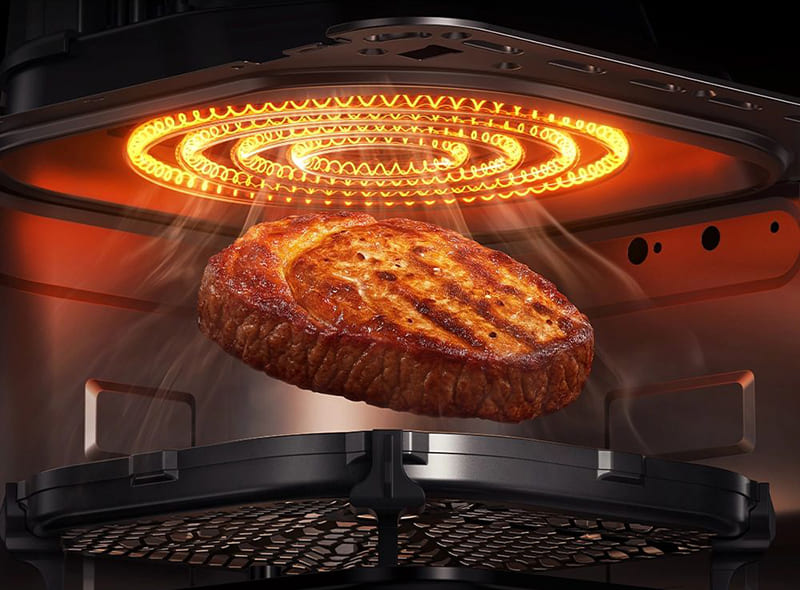 Одной из ключевых особенностей является технология циклонного вулканического нагрева VolcanicFlow, которая обеспечивает равномерную и хрустящую корочку со всех сторон продуктов без необходимости их переворачивания. Эта инновационная система распределяет тепло идеально равномерно по всему объёму камеры, гарантируя отличные результаты при каждом использовании.