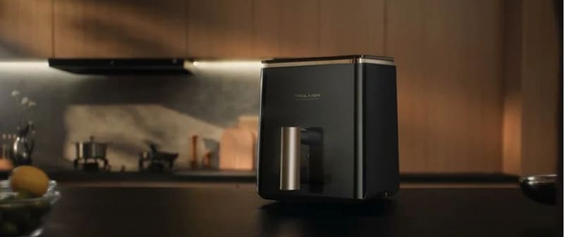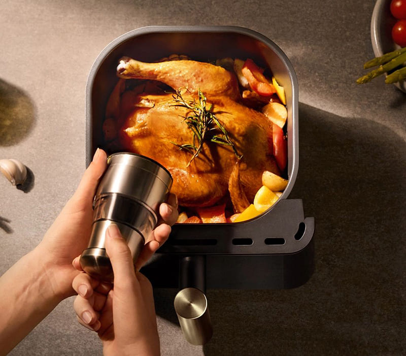 Аэрогриль выполнен в стильном минималистичном дизайне с элегантным чёрным матовым корпусом из пластика высокого качества. На верхней панели расположены сенсорные кнопки управления, обеспечивающие интуитивное взаимодействие с устройством. Компактные габариты 25 × 36,5 × 32,6 см и вес примерно 5 кг позволяют без проблем разместить аэрогриль на кухне, не занимая при этом слишком много места.