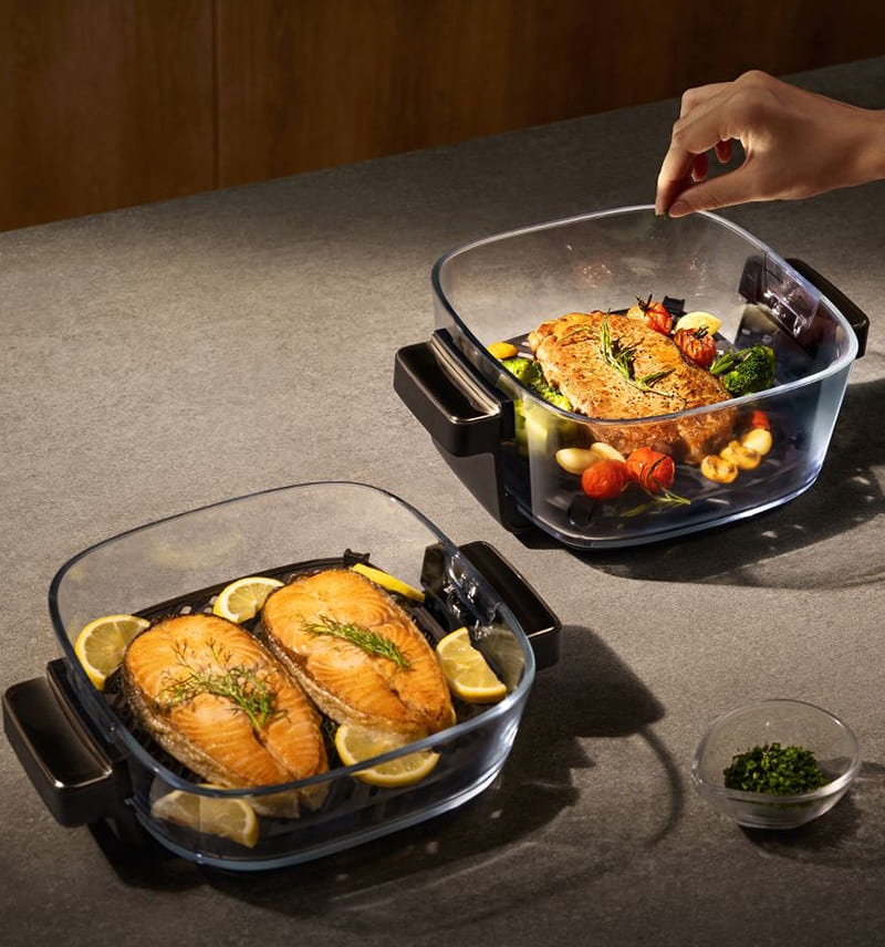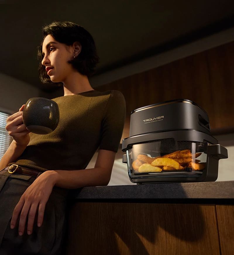 Аэрогриль имеет элегантный минималистичный дизайн с чёрным матовым пластиковым корпусом и полностью стеклянной нижней частью, позволяющей визуально контролировать процесс приготовления пищи без открывания крышки. Компактные габариты 300 × 250 × 225 мм не займут много места на кухне.