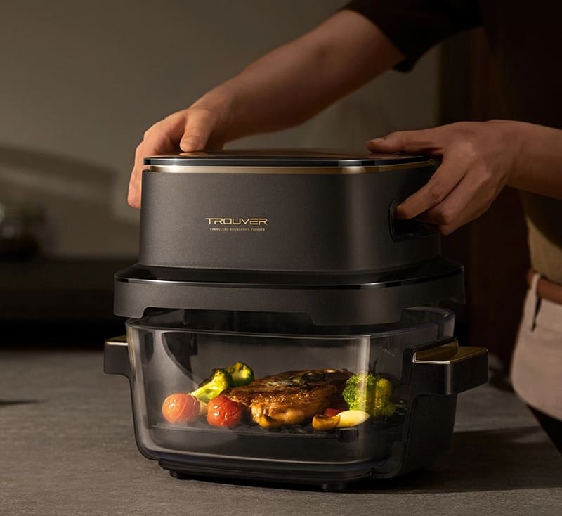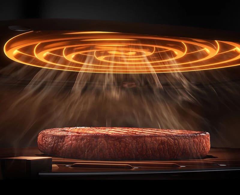 Аэрогриль работает в диапазоне от 40 до 185°C, подходит для низкотемпературного приготовления на пару, рыбы и морепродуктов, овощей, выпечки и запечённых блюд. Точный контроль температуры осуществляется через сенсорное управление с использованием NTC-матрицы.
