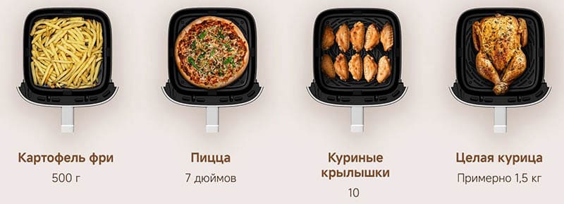 Объем 6,5 л позволяет готовить целую курицу и легко справляться с семейными обедами и посиделками. Картофель фри — 500 г Пицца — 7" Куриные крылышки — 10 шт Целая курица — около 1,5 кг
